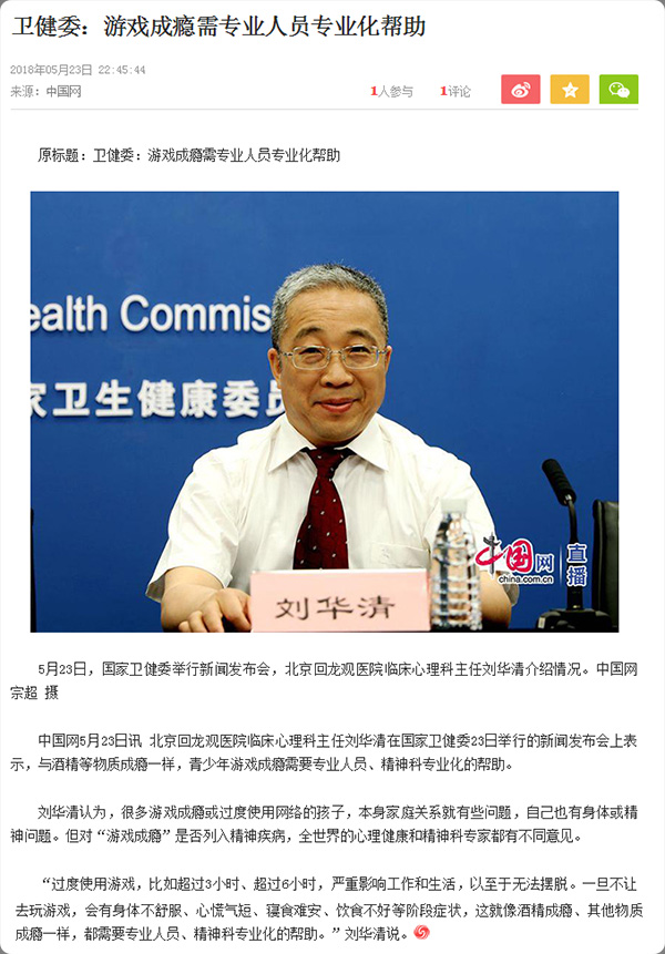 2018年05月,卫健委举行新闻发布会,并告诫:游戏成瘾需专业人员专业化帮助。需要到正规医院诊疗!