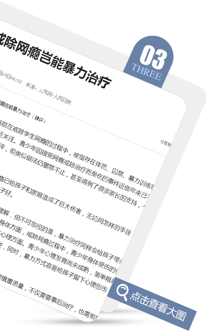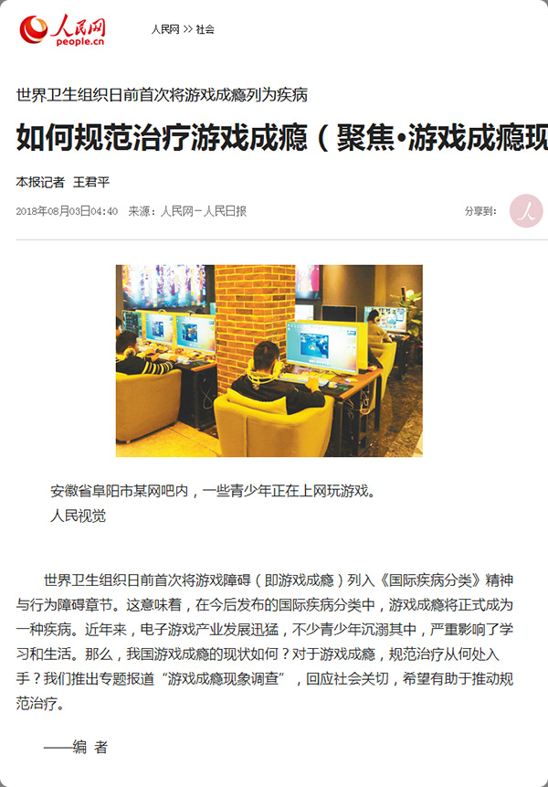 2018年08月04日,人民网及人民日报呼吁,戒网瘾应符合科学原则,拒绝军事化,去正规医院治疗。