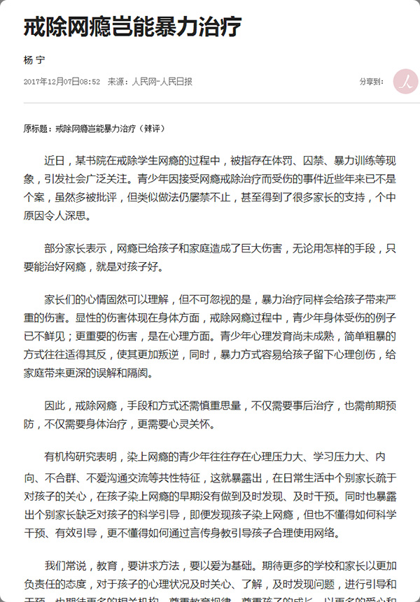 2017年12月,人民日报发文抨击,戒网瘾岂能暴力治疗?